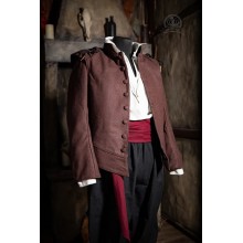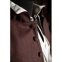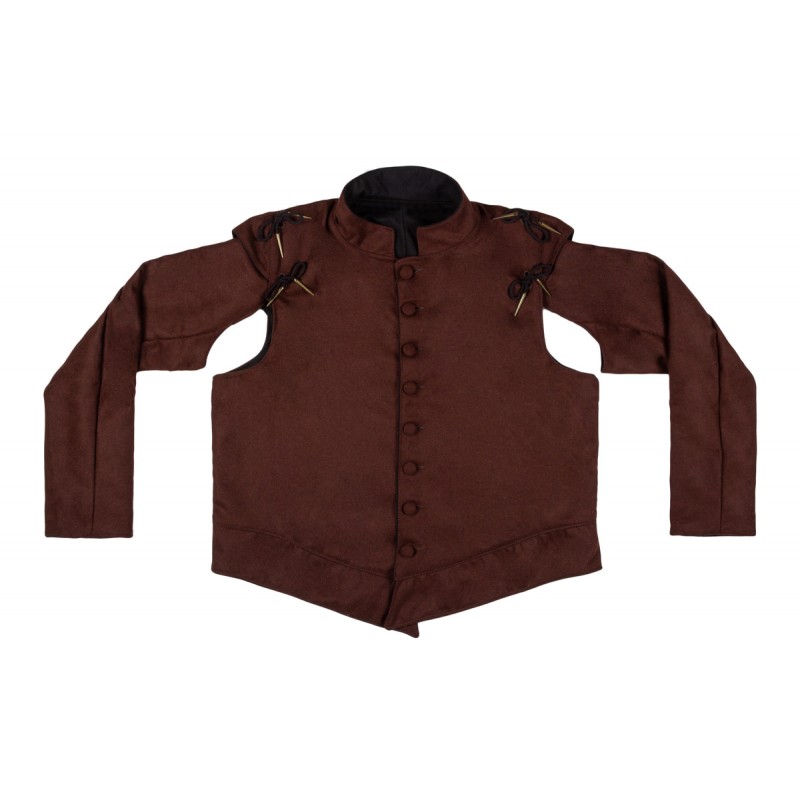 Ce doublet se ferme par des boutons et est confectionné en drap de laine marron. Les manches sont fixées au torse grâce à des lacets avec des lacets en laiton.