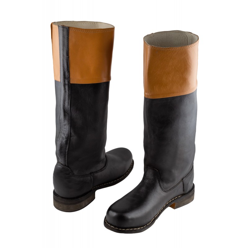 Ces bottes reproduisent un modèle très répandu et d'usage civil ou militaire courant dans toute l'Europe, dès la Révolution et dont l'usage perdure jusqu'au XXème siècle. Ils sont fabriqués en cuir de vachette teinté noir et sont particulièrement résistants et durables. La bande supérieure marron caractéristique les rend incomparables. La semelle est en cuir et mesure 1 cm de large, ce qui la rend très résistante, même adaptée à l'installation de crampons militaires si le reconstituteur l'envisage.