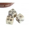 Cet ensemble de dés est fabriqué à la main à partir d’os, comme de nombreux originaux conservés. Les dés sont basés sur des modèles historiques utilisés dans l'Antiquité. Contrairement à aujourd’hui, les pointes des dés n’étaient pas constituées de cercles pleins mais plutôt d’une sorte d’oculi ou d’yeux, dessinant un cercle avec un petit point au centre. Les Romains avaient un amour excessif pour le jeu et pour les militaires, c'était un passe-temps quotidien et une occasion de parier de l'argent avec leurs compagnons.