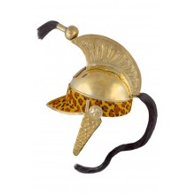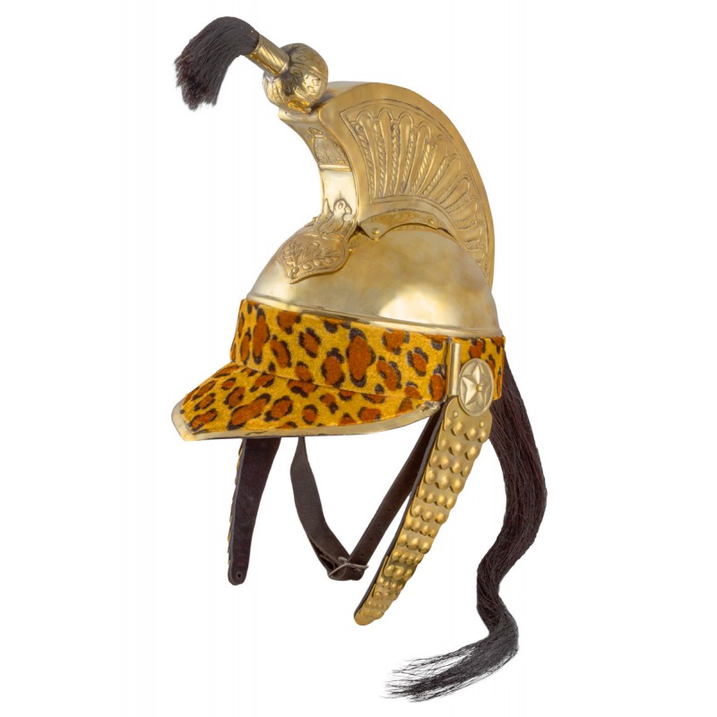 Il est en laiton et présente une haute crête décorée, surmontée d'un pommeau et d'une plume en crin noir. À l'ourlet, une autre plume en crin noir fait office de queue de cheval. Il comprend un tube permettant d'attacher le plumeau rouge sur le côté.