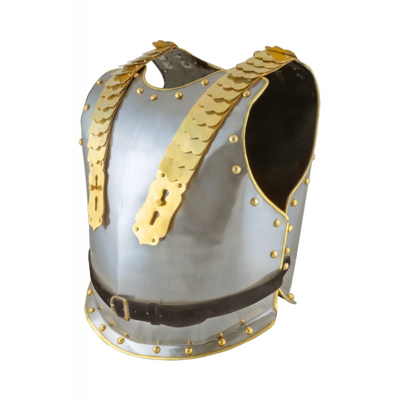 L'armure des régiments de cuirassiers français se composait d'une cuirasse et d'une plaque dorsale ornées de rivets dorés, initialement en cuivre. Un double système de fixation était utilisé. D'une part, des bretelles en cuir étaient rivetées à la plaque dorsale et ajustées à deux pattes de la cuirasse. Ces bretelles étaient recouvertes d'écailles de bronze pour la décoration et la protection du cuir. D'autre part, une lanière de cuir fixait les deux parties à la taille du soldat et ajustait l'ajustement.