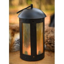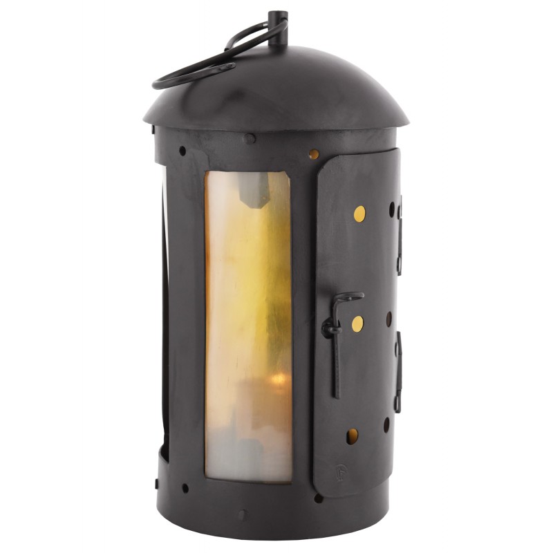Lanterne en fer avec fenêtres en corne authentiques. Entièrement fabriquée à la main, avec charnières et rivets. Un crochet en S est inclus pour la suspendre à une tente ou à un mur. Une bougie (non incluse) peut être insérée dans la petite porte, fixée par une épingle en fer, pour une utilisation optimale.