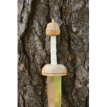 Manche en bois et os. Fourreau en bois, doublé de cuir rouge, avec anneaux extérieurs pour la fixation au baldrique fourni. Lame de fer.