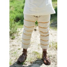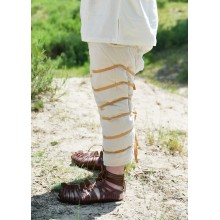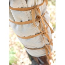 Ce jambière rembourré est basé sur certaines représentations de l'époque. Il convient très bien pour recréer le retiarius, un gladiateur qui a apprécié la légèreté de cette protection pour faciliter ses mouvements sur le sable. Le gladiateur pourrait en utiliser un sur la jambe la plus exposée, mais il pourrait également utiliser les deux pour une protection plus complète. Il y a huit lanières en cuir cousues au tissu pour un ajustement ajustable sur la jambe.