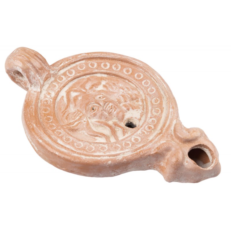 Lucerne romaine de volutes décorée de l'image de Méduse, la gorgone.