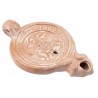 Comme beaucoup d'autres, ce type n'a pas de poignée et est en céramique rougeâtre, cuite à la main. Il est entièrement fonctionnel, et équipé de sa mèche et de son huile, il offrira de longues heures de récréation réaliste.