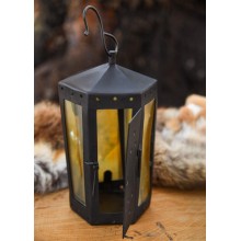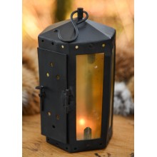 Fabriqué en fer forgé, ses pièces sont rivetées. La livraison comprend un crochet en S pour accrocher ou transporter la lanterne. L'une des faces forme une porte arrière pour insérer des bougies.