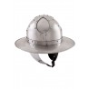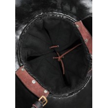 Cette chapel de fer comprend des joues, ce qui lui confère un aspect unique et réaliste. Ces joues sont fixées à la coque du casque par des lanières de cuir rivetées. La cape est fabriquée à la main en acier de 1,6 mm d'épaisseur, mais l'épaisseur atteint 5 mm aux endroits où les plaques se chevauchent.