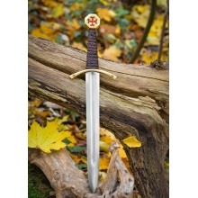 La lame en acier à ressort est d'une seule pièce jusqu'au pommeau et est plus large que les autres modèles, ce qui la rend également un peu plus lourde. La poignée est en bois et est enveloppée de cuir tressé. Le poignard est livré avec une gaine en cuir de deux couleurs, très élégante.
