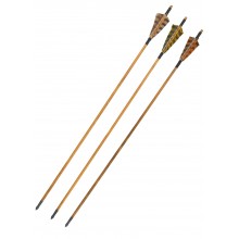 Nous représentons ici une flèche en bois avec une pointe de fer conique, très utile et pratique pour les présentoirs de tir à l'arc. Cette pointe permet une extraction confortable et une réutilisation indéfinie des flèches.