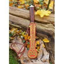 La superba replica di questo pugnale romano qui proposta si basa su frammenti metallici della placca decorativa del fodero trovati durante gli scavi a Dura Europos tra il 1928 e il 1937, nonché su altri ritrovati a Budapest, in Ungheria. Il fodero è realizzato in legno e cuoio rosso e il suo lato di mira è decorato con una placca di ottone traforata. Sebbene ad oggi ne siano stati registrati solo circa 200 esemplari, i ritrovamenti suggeriscono che questi foderi e la curiosa estremità spatolata erano caratteristiche comuni tra la fine del II e il IV secolo d.C.. Il fodero è inoltre dotato di due anelli di sospensione in ottone e di un cordoncino in cuoio. Alcuni reperti sembrano indicare che tali foderi erano sospesi alla cintura tramite la corda e portati in equilibrio orizzontale, con l'estremità del fodero che fungeva da contrappeso all'impugnatura.