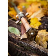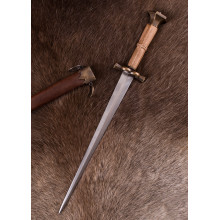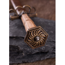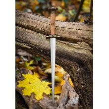 Questa bella replica qui proposta si basa su un originale dell'inizio del XVI secolo (ca. 1510-1540) conservato nella collezione del Metropolitan Museum of Art di New York. La lama è realizzata in acciaio elastico EN45, ha una sezione trasversale a diamante e si assottiglia fino a raggiungere una punta aguzza. I taglienti non sono affilati e il codolo è avvitato al pomo (dado superiore). La guardia e il pomo, dal design artistico, sono in ottone anticato e l'impugnatura è in legno intagliato. La guardia presenta piccole falche leggermente svasate e un anello laterale a forma di B, mentre il pomo esagonale si svasa verso l'alto in un cappuccio piatto e ornato.