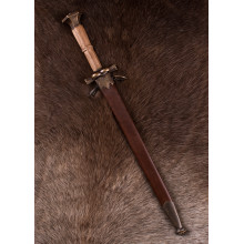 Questo pugnale è completato da un fodero in pelle conciata al vegetale accuratamente cucito, dotato di accessori in ottone anticato splendidamente ornati (una ghiera che termina con un bottone finale e una fibbia con anelli incernierati per agganciarlo alla cintura).