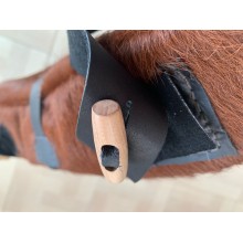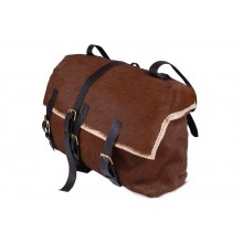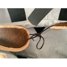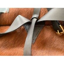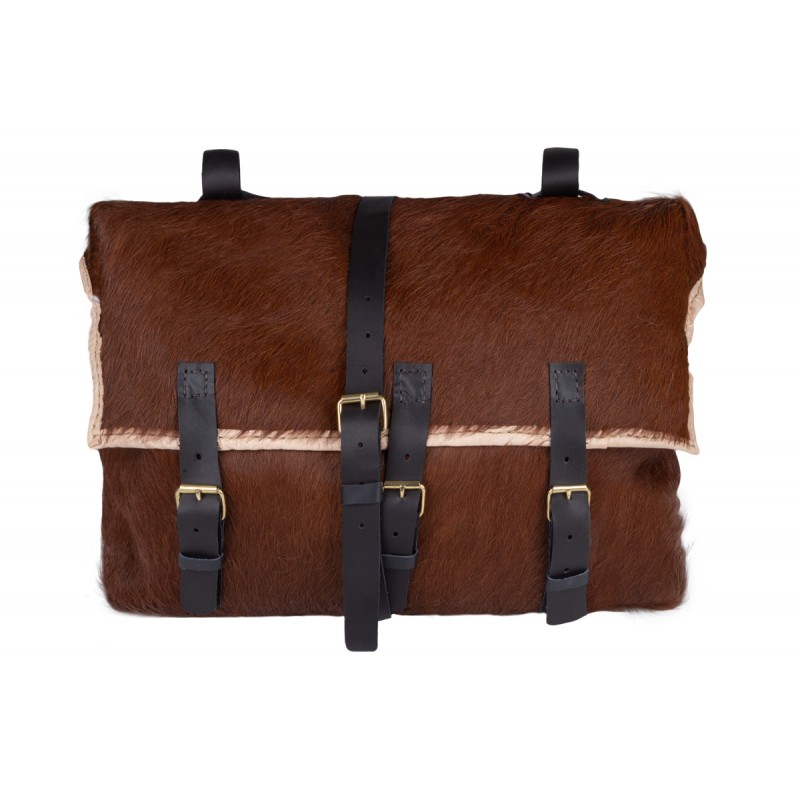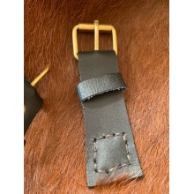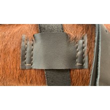 È di fattura eccezionale. È stato realizzato con pelle di mucca spagnola di castagno di prima qualità, con pelle tinta su un lato in nero per i cinturini e in nocciola per il bordo. La copertura include le due alette laterali di regolazione che si fissano con un cordoncino di cuoio quadrato di spessore 4 mm. La copertura si chiude con tre cinturini con fibbie. Tutte le cuciture vengono eseguite a mano, con strumenti artigianali tradizionali.