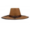 Questa replica è realizzata in pelle riciclata ed ecologica, con il fiore visibile sulla parte inferiore dell'ala. È decorato con un nastro di cuoio, un materiale che riveste anche il bordo dell'ala per conferirle resistenza. Una fibbia in ottone anticato orna la parte anteriore del cappello.
