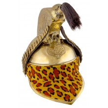 È realizzato in ottone con un alto cimiero decorato, sormontato da un pomolo e da un pennacchio di crine di cavallo nero. Sull'orlo, un altro pennacchio di crine di cavallo nero funge da equiseto. Include un tubo per il fissaggio laterale dello spolverino rosso.