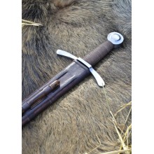 Replica di una spada medievale a una mano con la caratteristica impugnatura a forma di disco. Questo tipo di spada era diffuso in tutta la cristianità dal XIII secolo. Era il tipo di spada più comune per viaggiare in Terra Santa. Nella penisola iberica, si è rivelata l'arma più comune all'epoca dell'espansionismo castigliano e dell'annessione del Regno di León a partire dal XIII secolo.