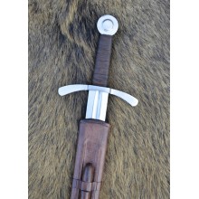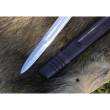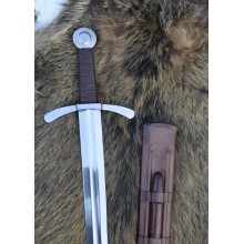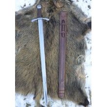 Questa spada è interamente realizzata a mano. La guardia e il pomo sono forgiati in acciaio. La lama è rivettata a mano sul pomo. L'impugnatura è in cuoio con pochi ornamenti. La lama è scanalata e offre una grande flessibilità e un peso ridotto. I bordi non sono affilati. È incluso un bellissimo e realistico fodero in legno rivestito in pelle con passante per cintura (larghezza massima della cintura 5 cm).