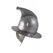 Elmo da gladiatore di tipo trace in acciaio opaco, meno decorato dell'originale ma dall'aspetto rustico e realistico. L'elmo, pur proteggendo il gladiatore, rendeva il combattimento molto difficile, in quanto non solo ostacolava la vista, ma rendeva difficile anche la respirazione e l'udito. Questo significa che il gladiatore di tipo trace, così come il secutor, doveva combattere frontalmente ed evitare di perdere di vista l'avversario.