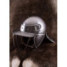 Le code di aragosta potevano includere traverse o creste sulla calotta e barre di protezione per il viso, come possiamo vedere in questa replica. L'elmo a coda di aragosta, da cui questo elmo prende il nome, è composto da tre piastre rivettate che fungono da copertura. L'interno del casco incorpora un pratico rivestimento in pelle regolabile.