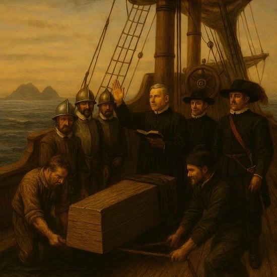Ricostruzione ipotetica tramite IA della cerimonia di sepoltura marittima di García de Silva a bordo della caravella che lo riportava in Spagna. Sullo sfondo, a sinistra, le isole di Flores e Corvo, le più occidentali delle Azzorre.